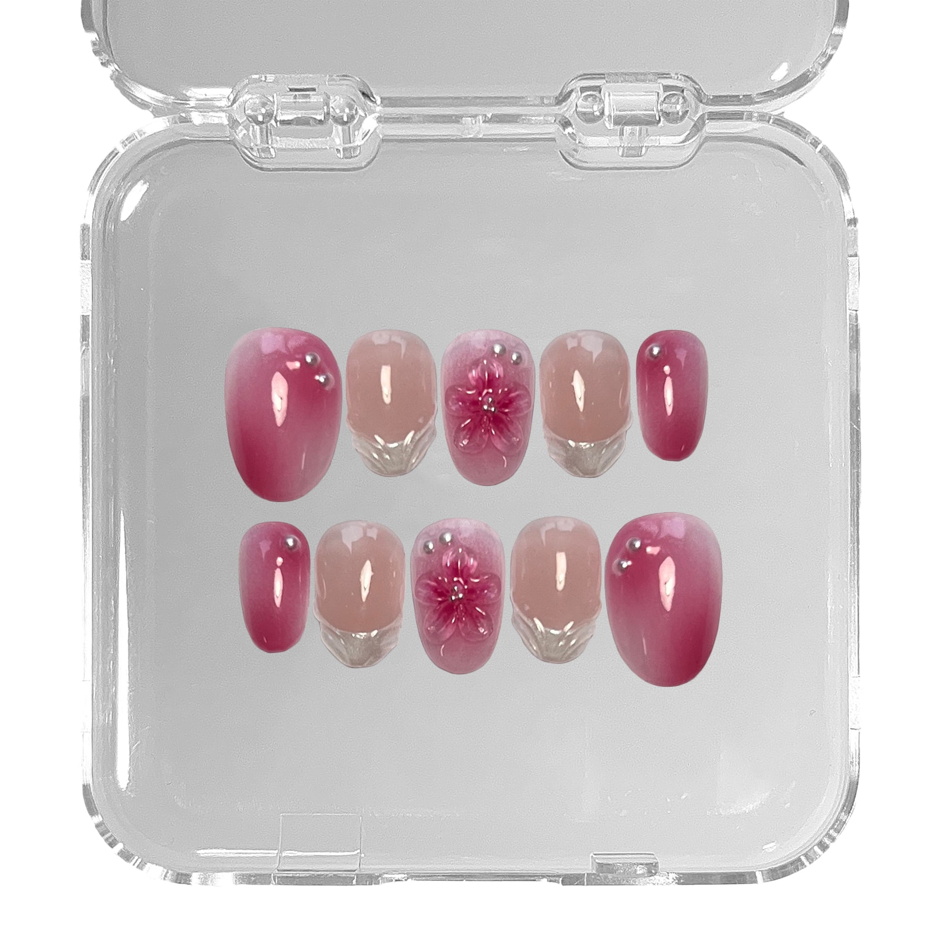 YOU WILL RECEIVE YOUR NAILS IN A CLEAR ACRYLIC CASE FOR SAFE STORAGE. 1 NAIL APPLICATION TOOL KIT INCLUDED.