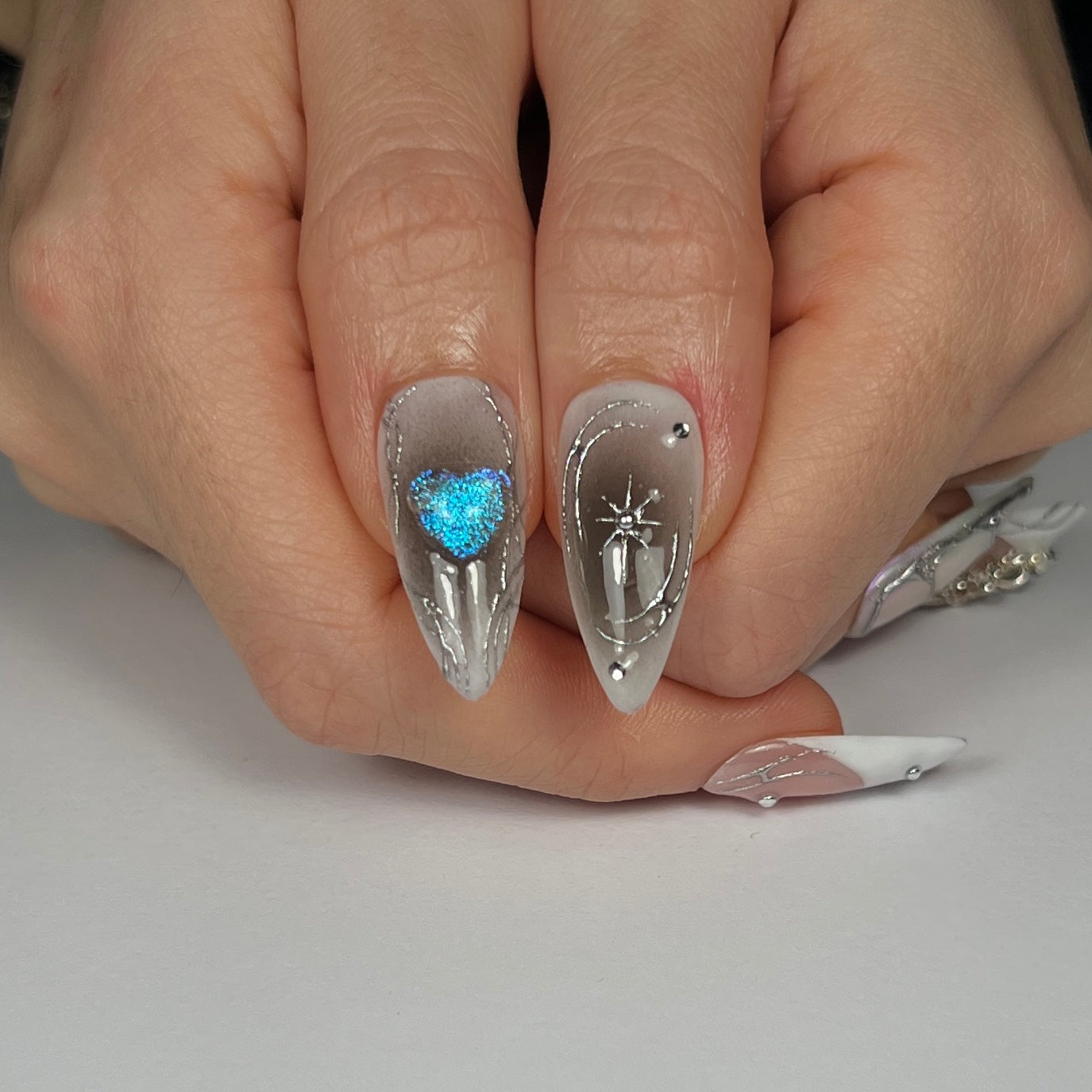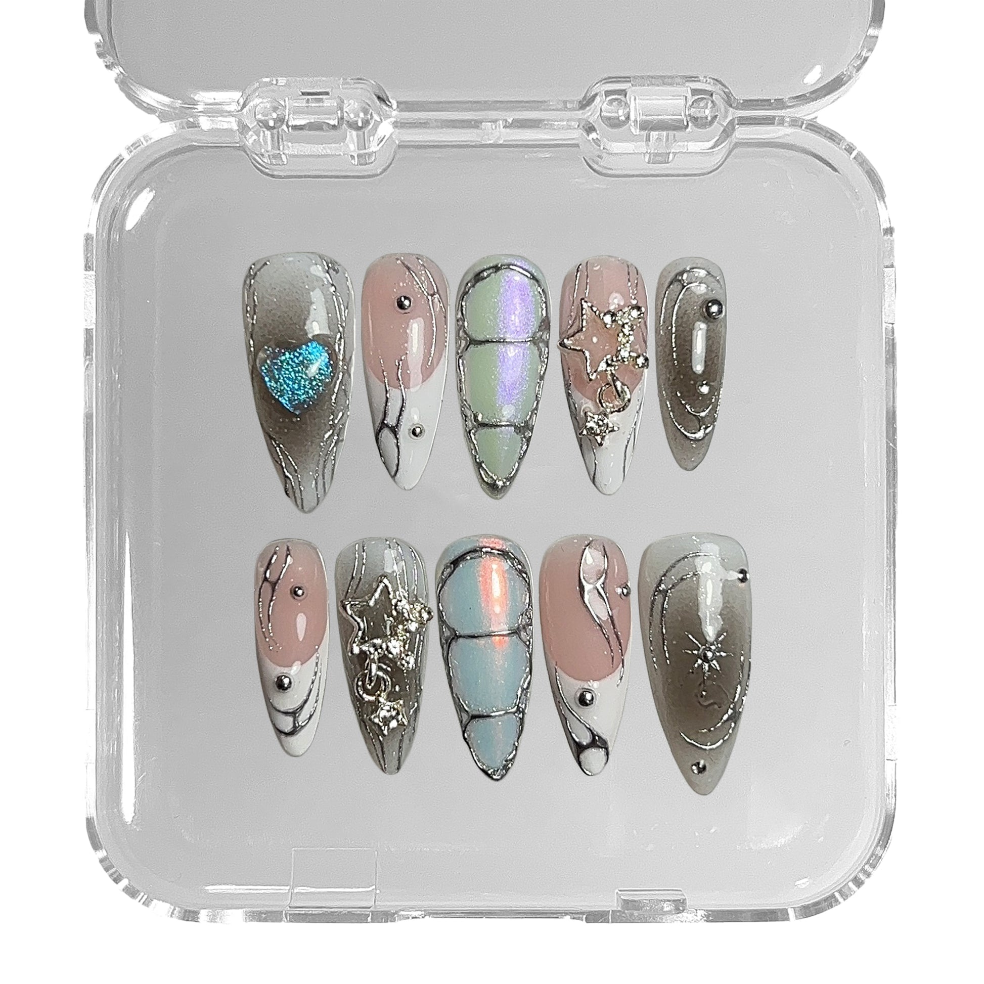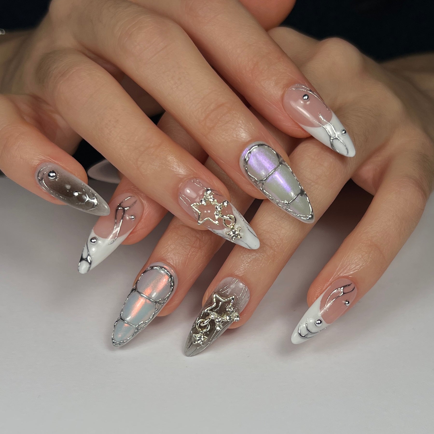CYBER GAL FEATURES A BLEND OF CLASSIC FRENCH TIPS WITH VARIOUS CREATIVE ELEMENTS: GRADIENTS, LAYERED IRIDESCENT CHROME, HAND PAINTED DETAILS, SILVER CHROME THAT EVOKES MOLTEN METAL AND CHARMS THAT COMPLEMENT AND UNIFY THE CYBERCORE CONCEPT THAT INSPIRED IT.