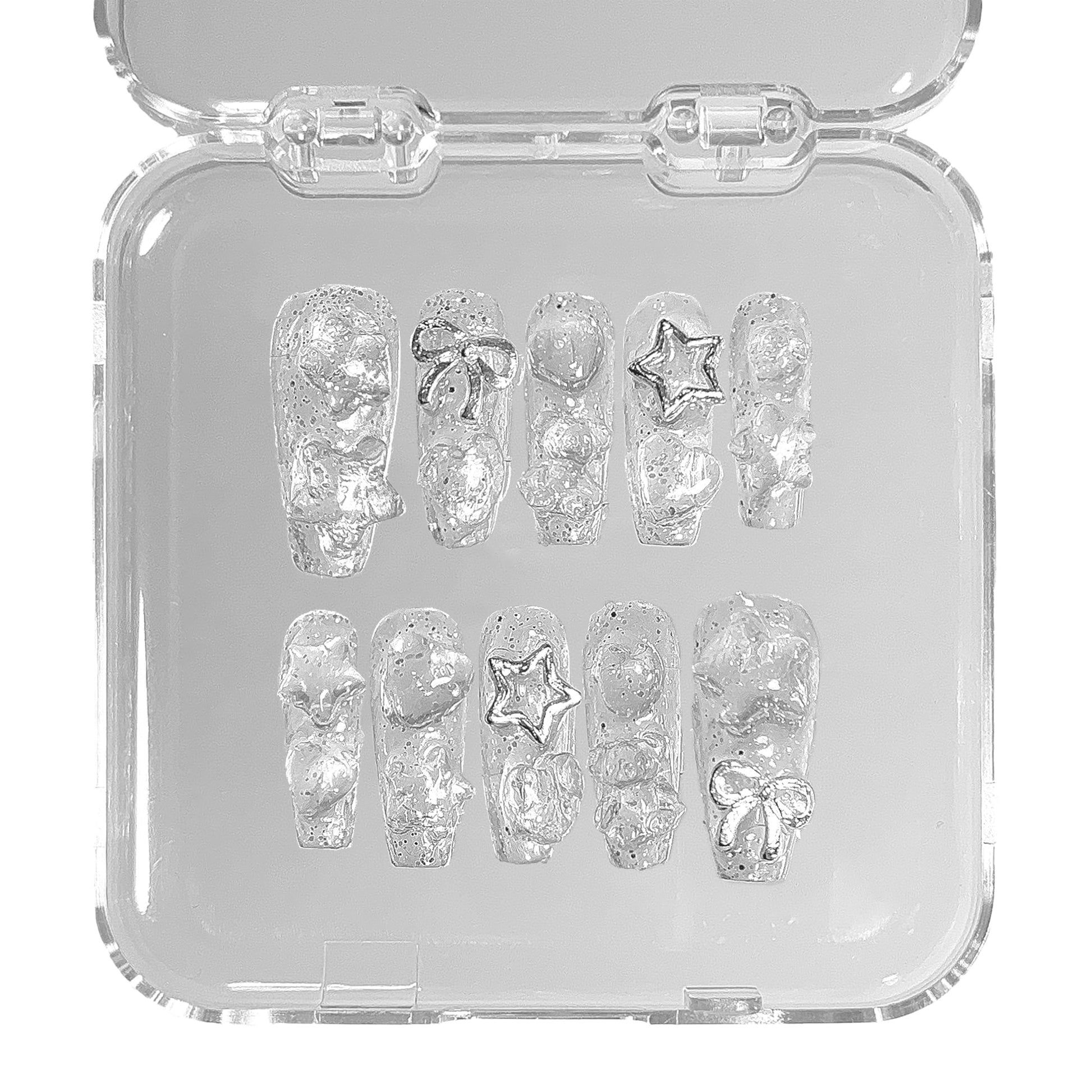 YOU WILL RECEIVE YOUR NAILS IN A CLEAR ACRYLIC CASE FOR SAFE STORAGE. 1 NAIL APPLICATION TOOL KIT INCLUDED.