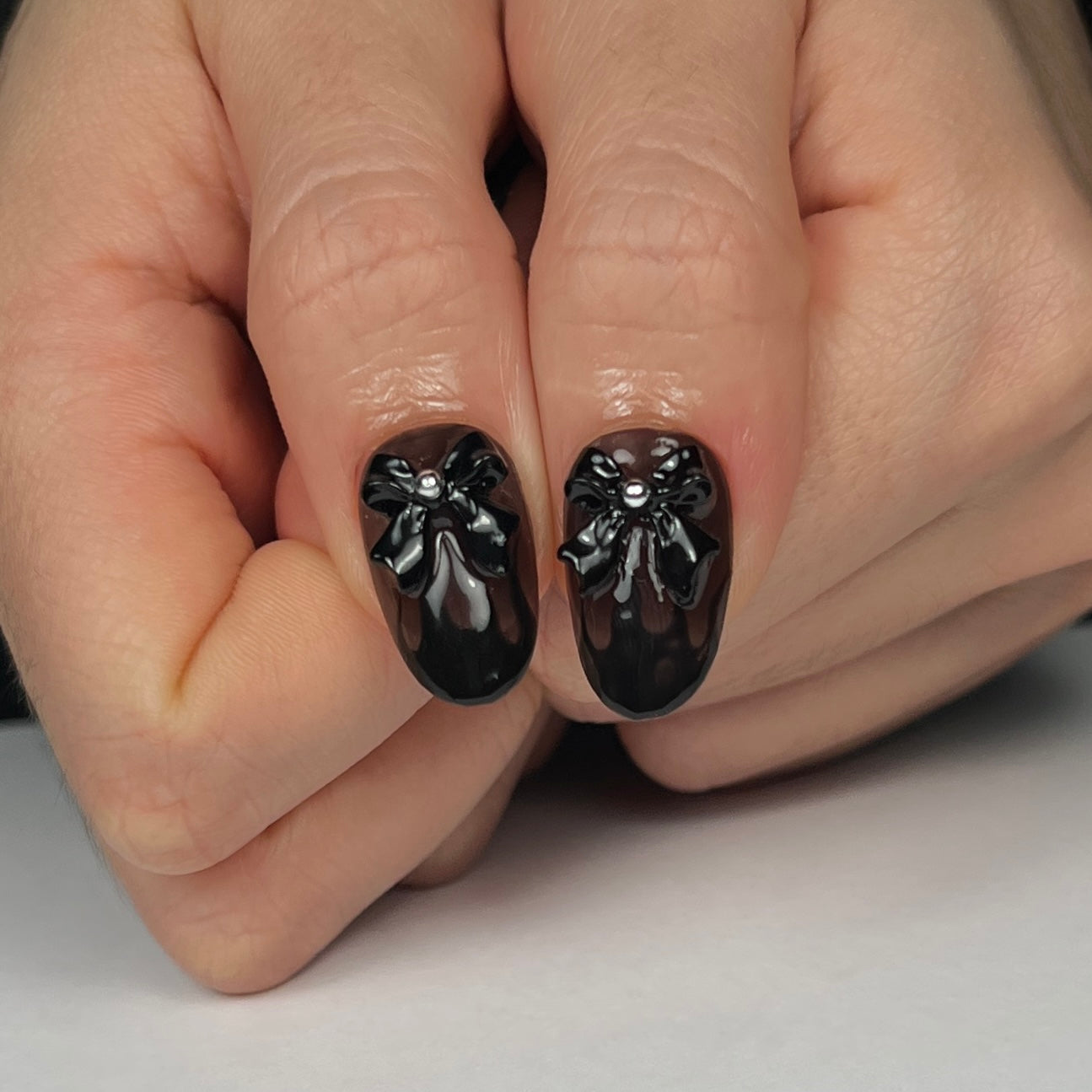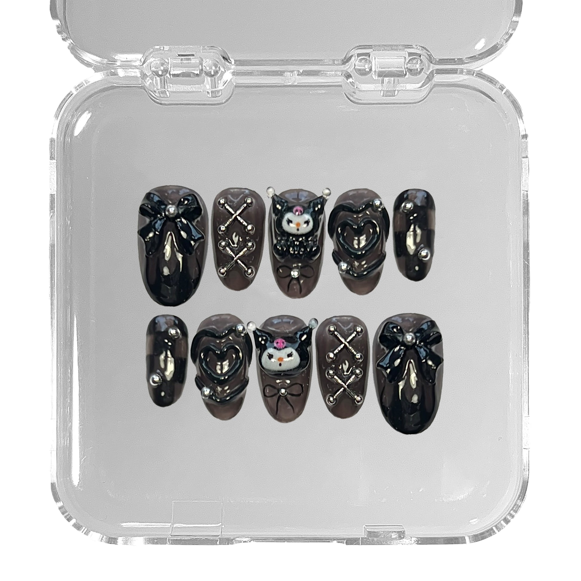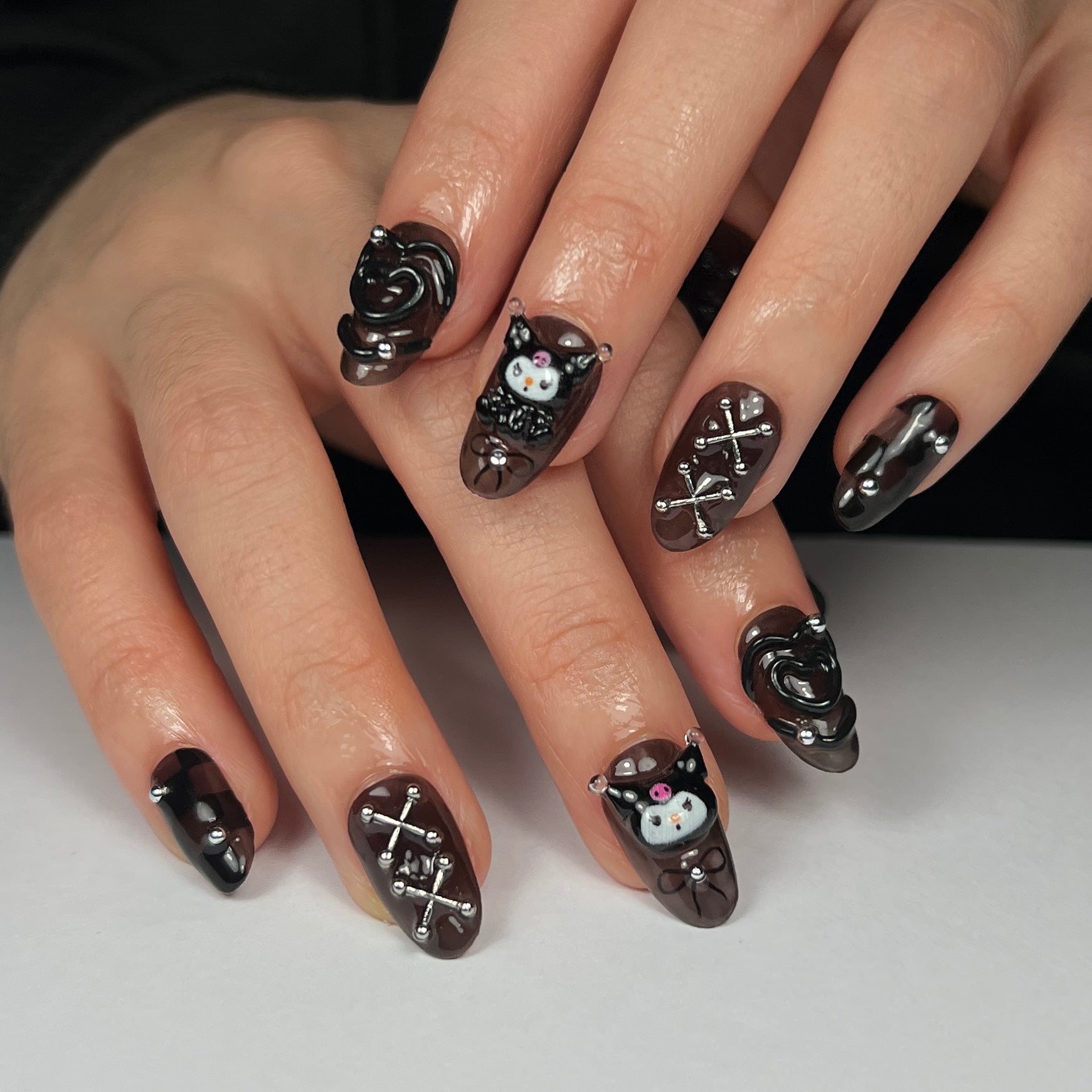 MISCHIEF MAKER IS A SET INSPIRED BY KUROMI, FEATURES A SHEER JELLY BLACK BASE, DECORATED WITH HAND-SCULPTED 3D GEL HEARTS, HAND-PAINTED DETAILS, SILVER CHARMS AND PEARLS, FOR A PLAYFUL, CUTE LOOK WITH A GOTHIC TOUCH.