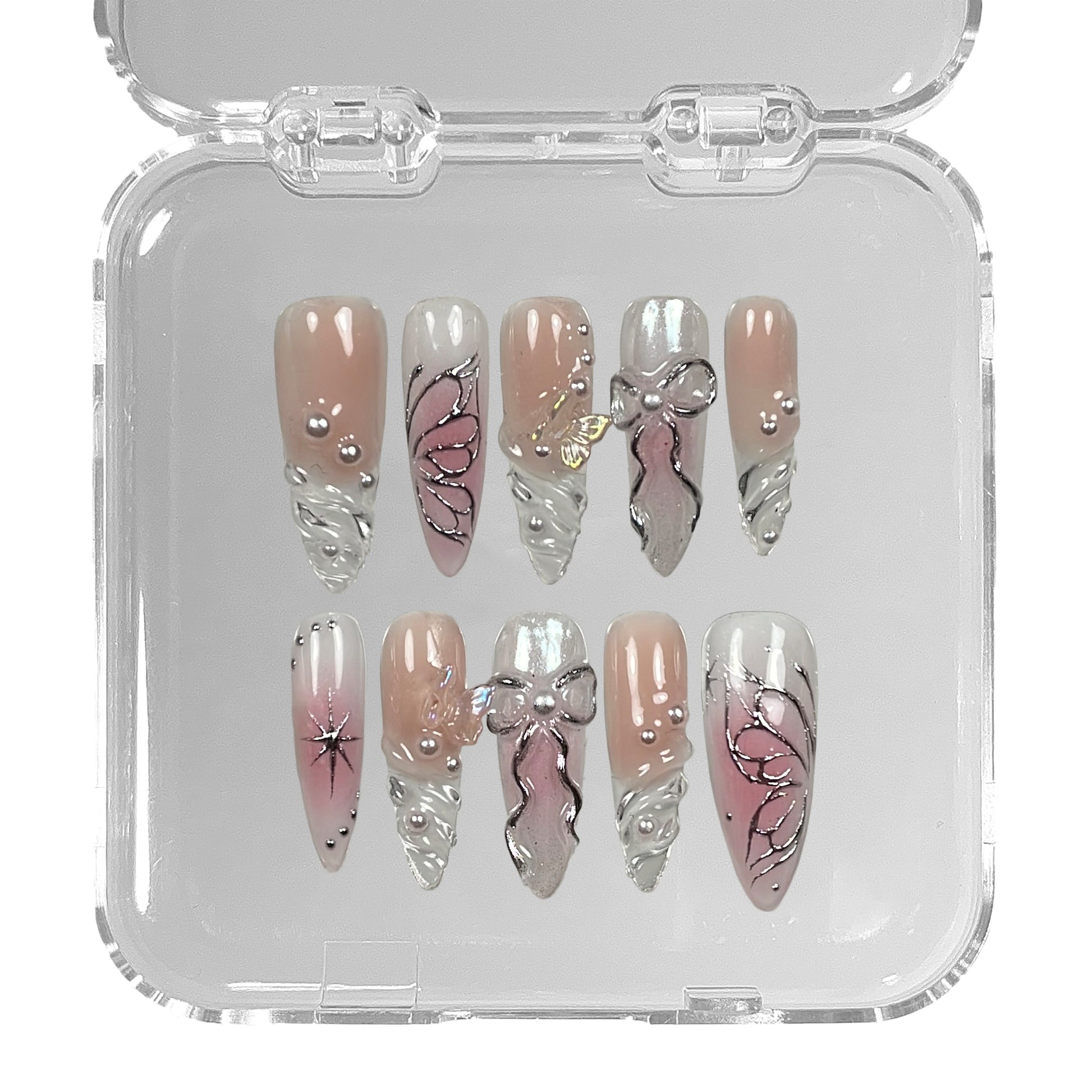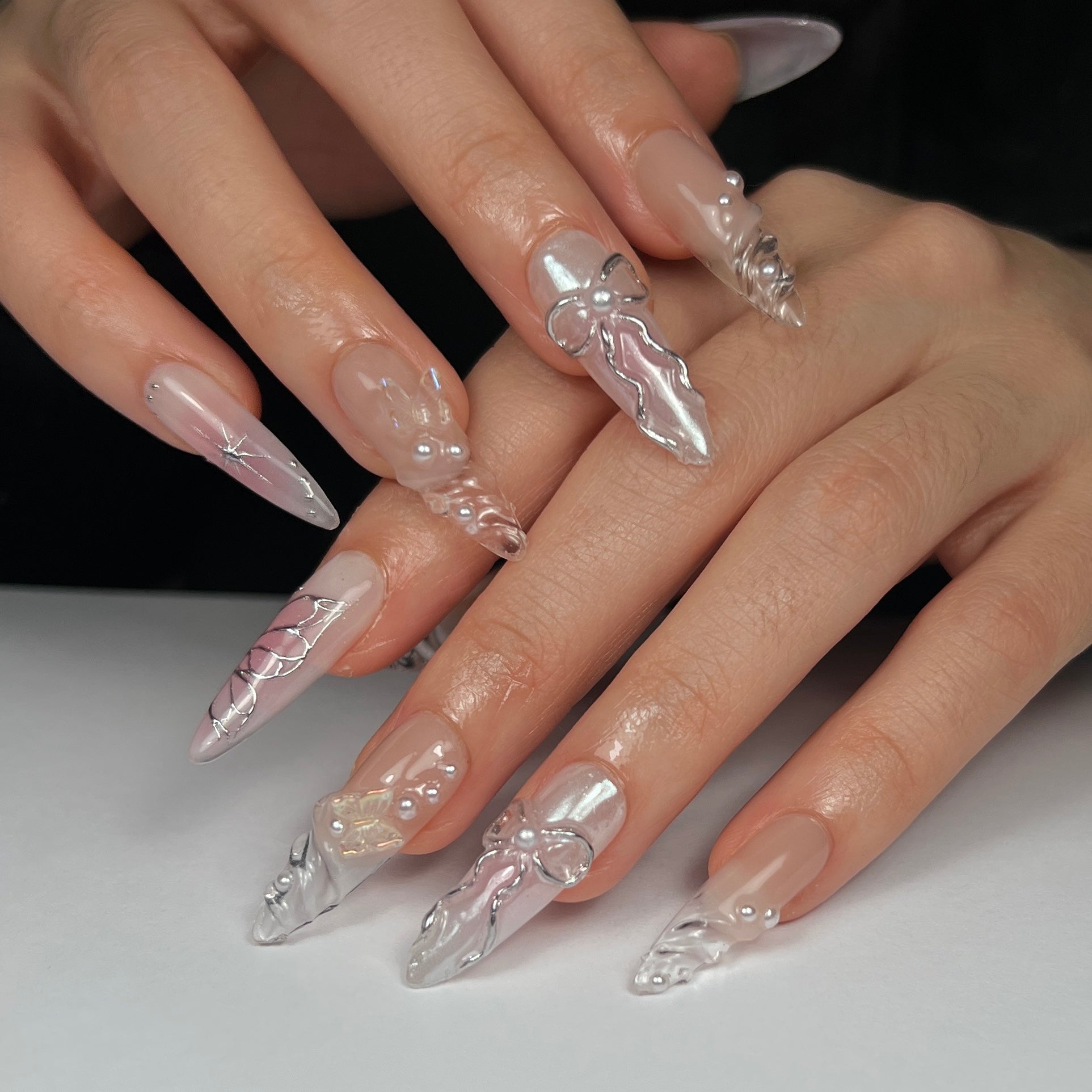 PIXIE BOWS FEATURES A NUDE BASE WITH SOFT PINK GRADIENTS. IT'S DECORATED WITH CLEAR FRENCH TIPS, IRREGULAR 3D GEL SWIRLS, HAND-SCULPTED BOWS, SILVER CHROME PAINTED DETAILS, BUTTERFLY CHARMS AND PEARLS, FOR A WHIMSICAL AND SOFT LOOK.