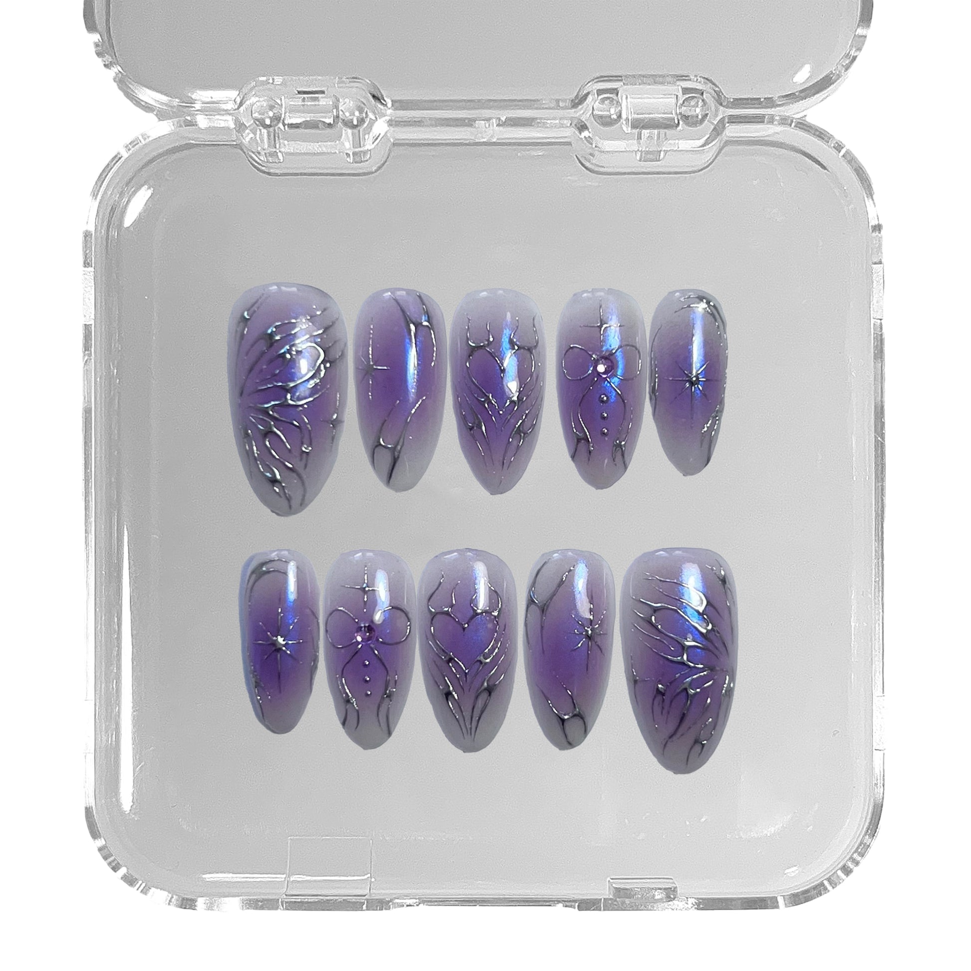 PURPLE GLITCH FEATURES HAND-PAINTED SILVER CHROME DETAILS INSPIRED BY Y2K-TECHCORE AESTHETICS, OVER A PURPLE GRADIENT BASE, LAYERED WITH IRIDESCENT PURPLE CHROME, FOR AN EDGY, CYBERCORE LOOK.