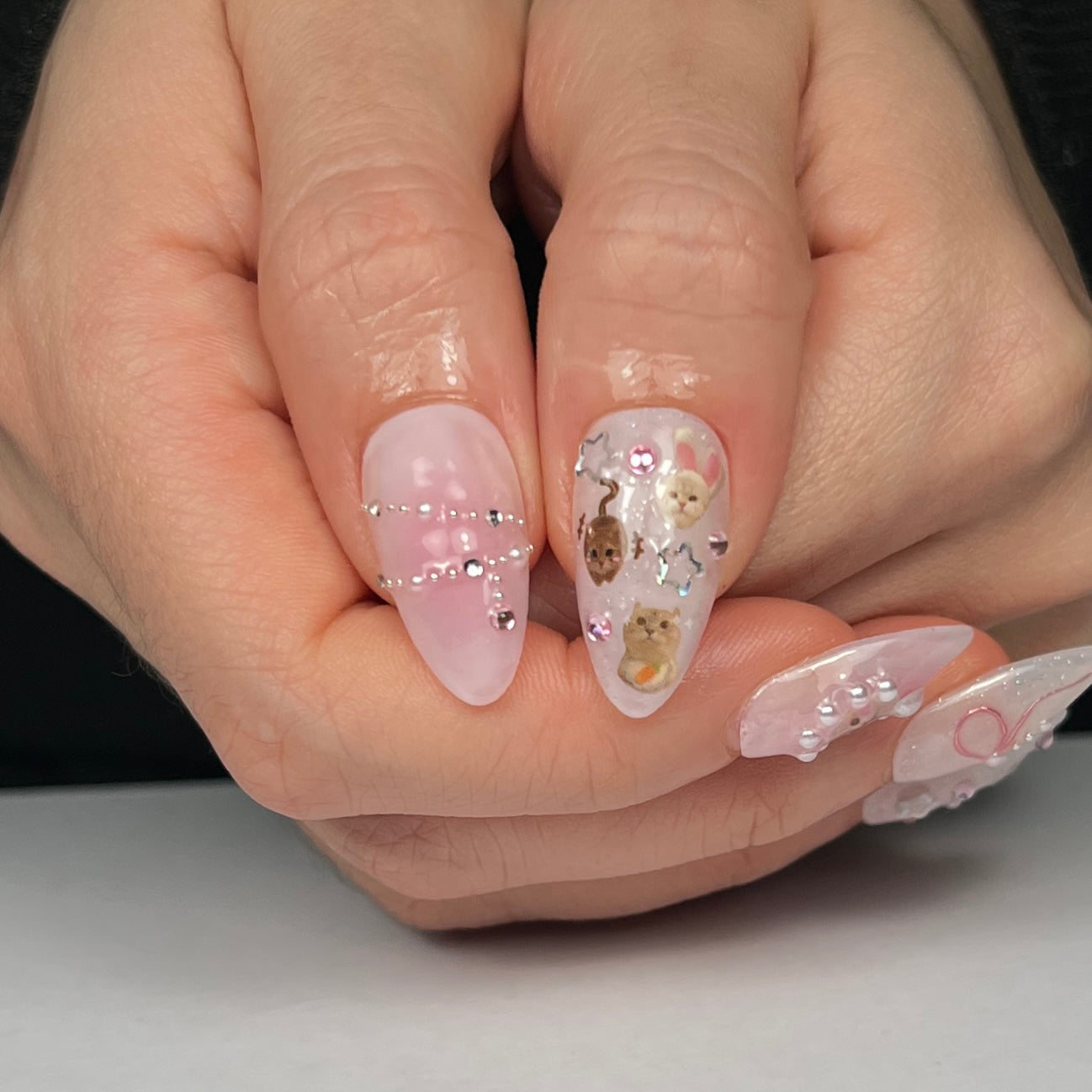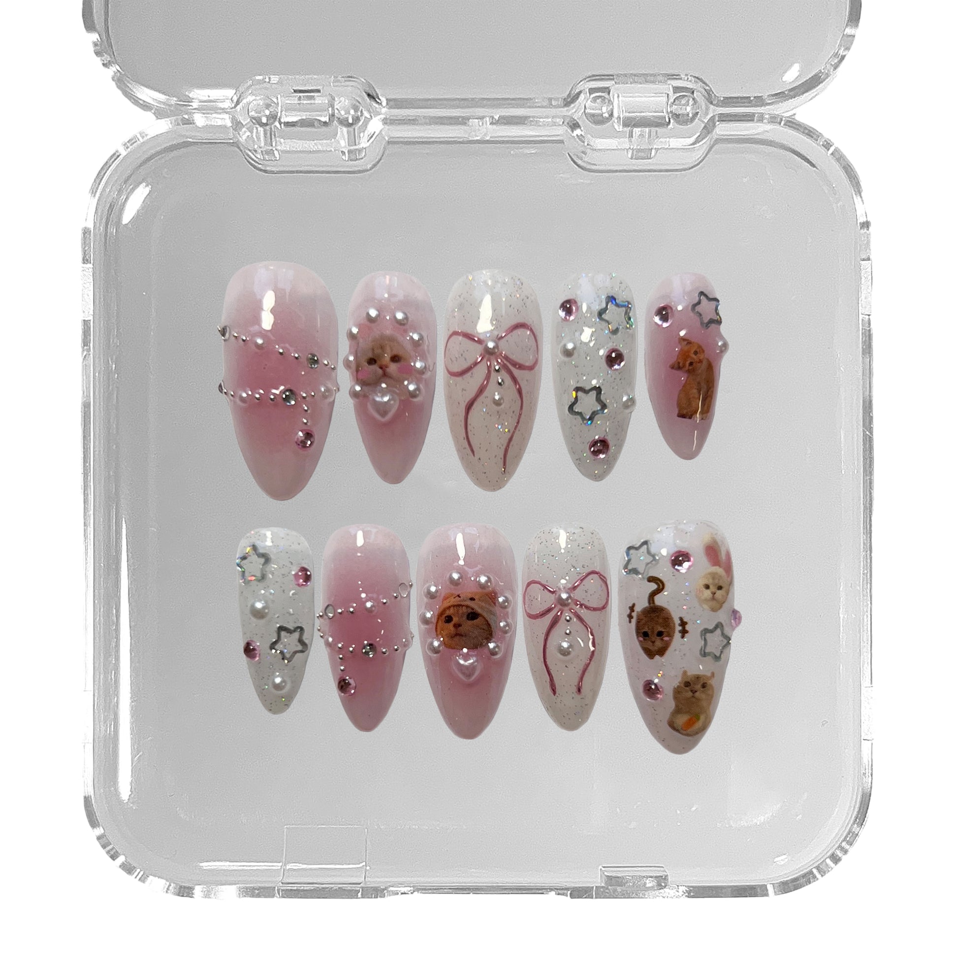 PURRTY IN PINK FEATURES SOFT PINK GRADIENTS, LAYERED WITH GLITTER, CUTE CAT STICKERS AND HAND-PAINTED CHROME PINK BOWS. IT'S COMPLEMENTED WITH SMALL PEARLS, RHINESTONES AND STARS, FOR A PLAYFUL, COQUETTE LOOK.